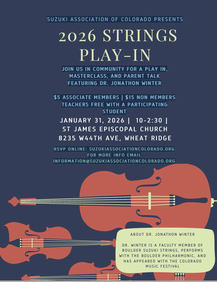 Dr. Jonathon Winter will give a talk with tips to Suzuki parents on best practices to support their students. Free to all students, families, and teachers who have signed up for any of the events above. Please click here to register here so we have a headcount for lunch.